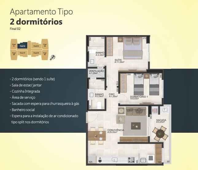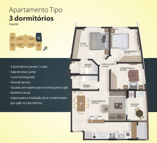 Apartamentos, 3 dormitórios sendo 1 suíte, e sacada com churrasqueira a gás, com 67,92 m² privativos, partir de R$ 683.500,00 (Apto 608 A)