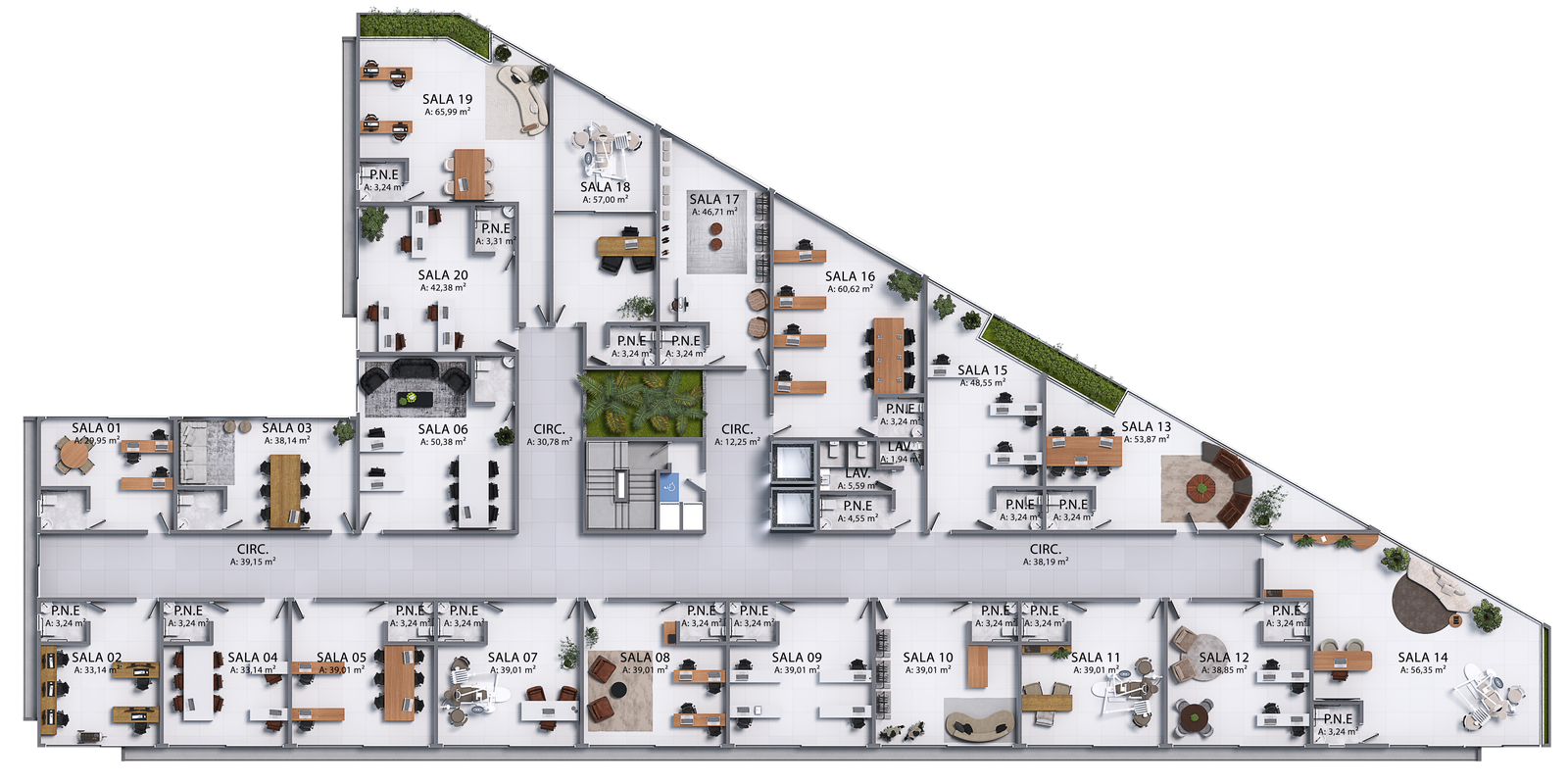 As salas comerciais variam de 29,95 m² até 210,67 m², oferecendo opções perfeitas para diferentes tipos de negócios.