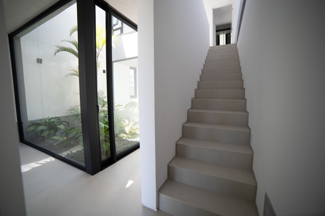 A residência foi concebida nos mínimos detalhes, com qualidade construtiva e soluções inteligentes. Um jardim interno conecta suavemente os dois pavimentos, levando luz natural e ventilação cruzada para todos os ambientes.